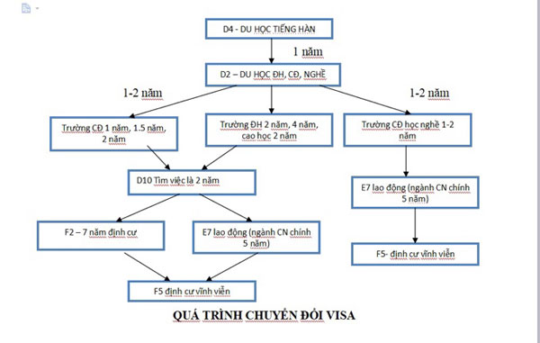 Đa số các bạn trẻ khi đi du học Hàn Quốc đều có mong muốn sau khi tốt nghiệp, ra trường mình sẽ ở lại Hàn Quốc làm việc hoặc sẽ định cư vĩnh viễn. Nhưng để có visa vĩnh viễn, đòi hỏi mỗi du học sinh phải trải qua quy trình chuyển đổi visa tương đối lâu dài, trải qua nhiều giai đoạn khác nhau. Cụ thể:
